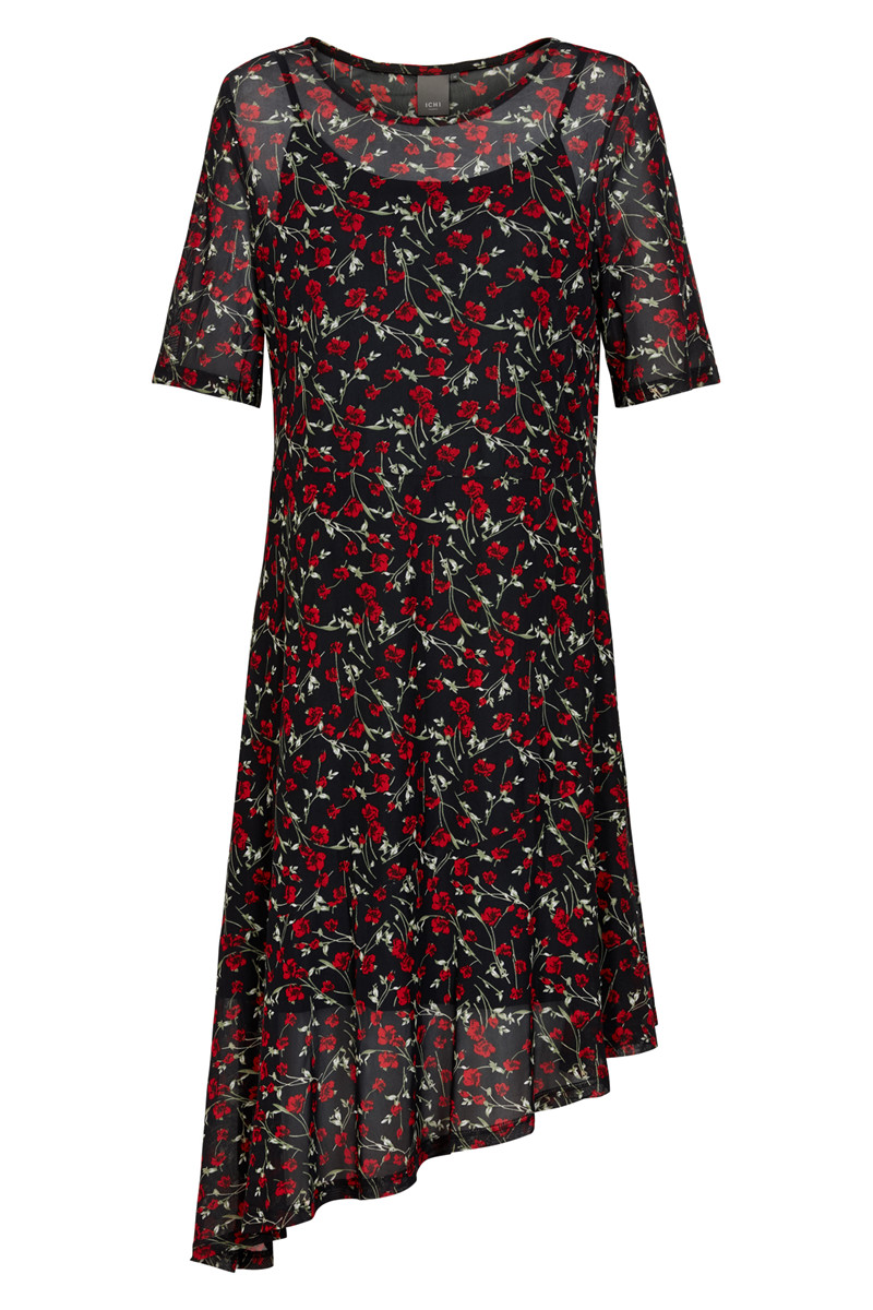 The Ichi Ixrose dress has an asymmetrical hem and is an A-line cut. The background is black and has a green and red floral print. Shell is shear, slip included.